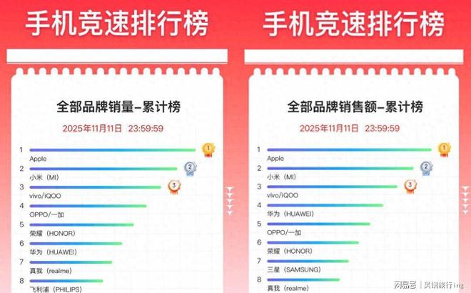 截止到11月11日23:59:59,京东平台公布手机数据,Vivo第三、小米第二,第一出乎意料。